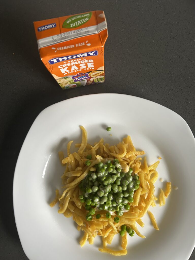 - Die Variante, die unsere Kids sehr gern gegessen haben: Spätzle + Erbsen + Käse-Sauce